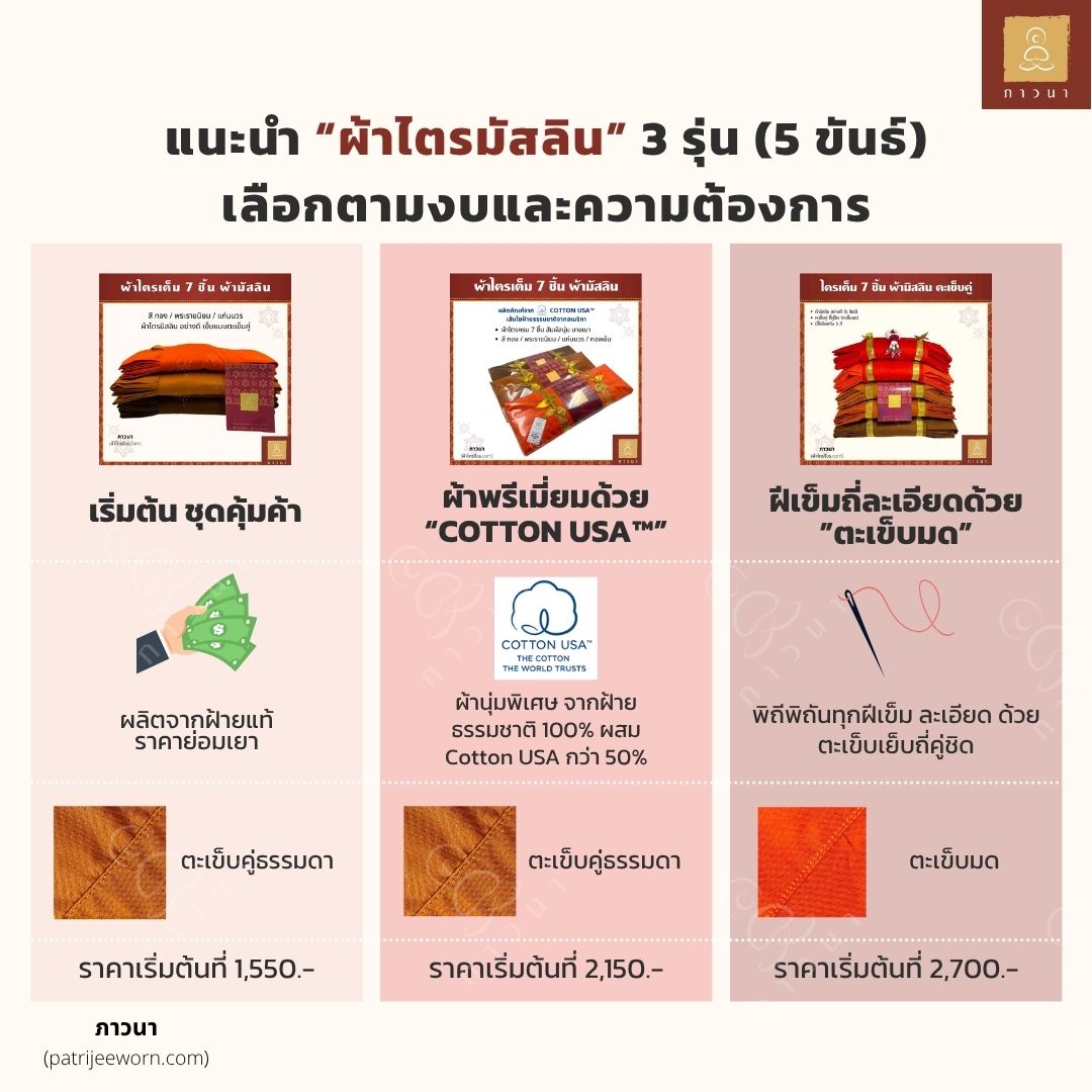 ทางภาวนามีขายผ้าไตรหลากหลายเนื้อผ้า สำหรับผ้าไตรถวายวัดทั่วไปแนะนำ ผ้าไตรมัสลิน 5 ขันธ์ สีพระราช ขนาด 2 เมตร เนื่องจากเป็นสีที่วัดส่วนใหญ่ใช้ได้ เป็นผ้าที่พระสงฆ์นิยม และเป็นขนาดที่เหมาะสำหรับพระสูงประมาณ 170 เซนติเมตร แต่อย่างไรแล้ว แนะนำให้สอบถามกับทางวัดจะดีที่สุดเพื่อพระสงฆ์ใช้งานได้จริง ก่อบุญกุศลสูงสุดแก่ผู้ถวาย