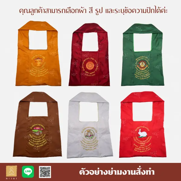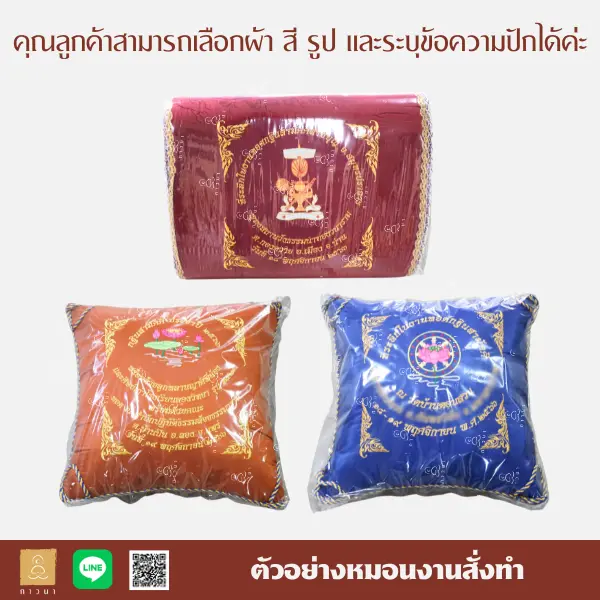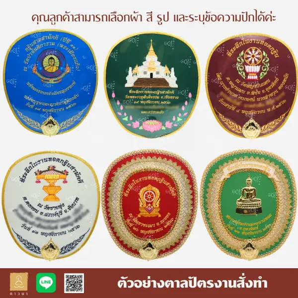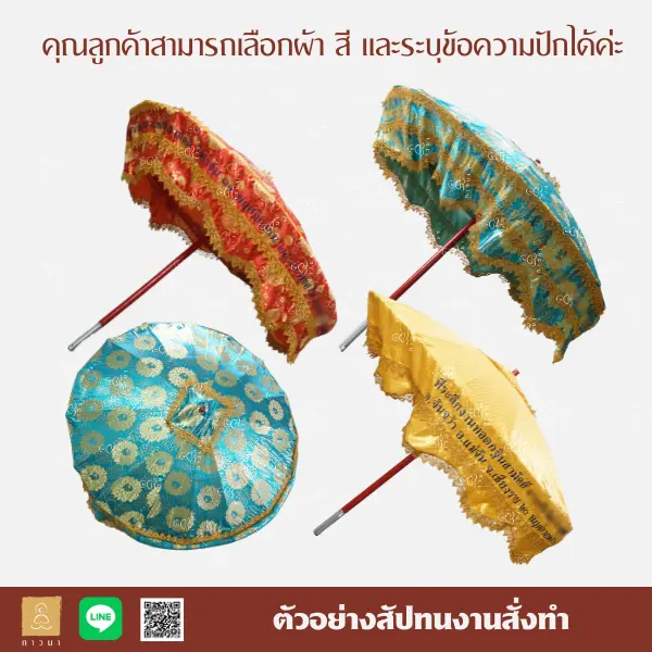 ทางภาวนารับผลิตตาลปัตร ถุงย่าม สัปทน และหมอนสำหรับงานพิธีต่าง ๆ สามารถดูภาพตัวอย่างได้ตามรูป โดยลูกค้าสามารถเลือกเนื้อผ้า/สี/รูป และระบุข้อความปักได้ตามความต้องการ