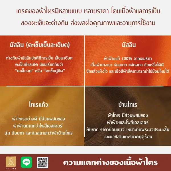 การเลือกผ้าไตร จีวร นั้นเหมือนกับการเลือกซื้อเสื้อผ้าที่เราสวมใส่ เกรดของผ้าไตรมีหลายแบบ หลายราคา โดยเนื้อผ้าก็จะแตกต่างกัน และต่างกันที่วิธีการเย็บของตะเข็บ ส่งผลต่อคุณภาพและอายุการใช้งาน