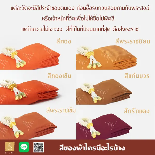 แต่ละวัดจะมีสีประจำของทางวัดเอง ดังนั้นก่อนซื้อ รบกวนคุณลูกค้าสอบถามกับพระสงฆ์หรือเจ้าหน้าที่วัดโดยตรง เพื่อความถูกต้อง และก่อให้เกิดประโยชน์สูงสุดในการทำบุญ แต่ถ้าถวายไม่เจาะจง สีที่เป็นที่นิยมมากที่สุด คือ สีพระราชนิยม