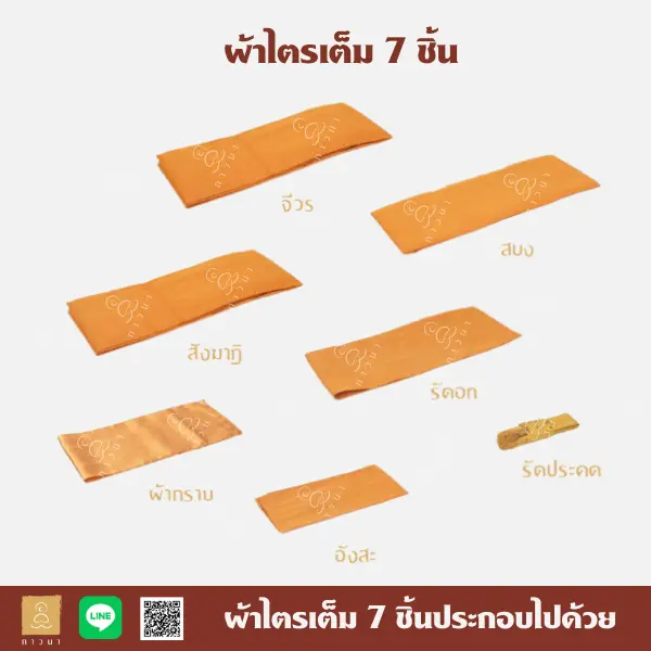 หากต้องการใช้ผ้าไตรสำหรับงานบวช จะเป็นไตรเต็ม 7 ชิ้น ประกอบไปด้วย