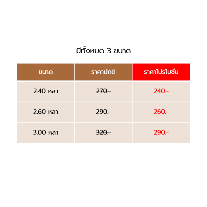 มีจำหน่ายทั้งหมด 3 ขนาดได้แก่ 2.40 หลา, 2.60 หลา และ 3.00 หลา