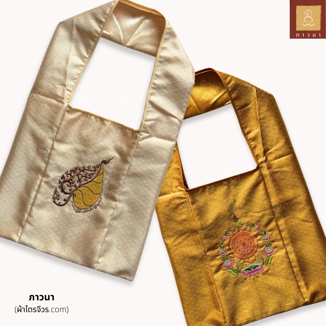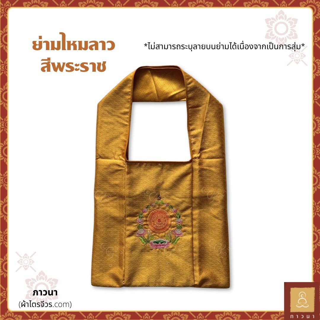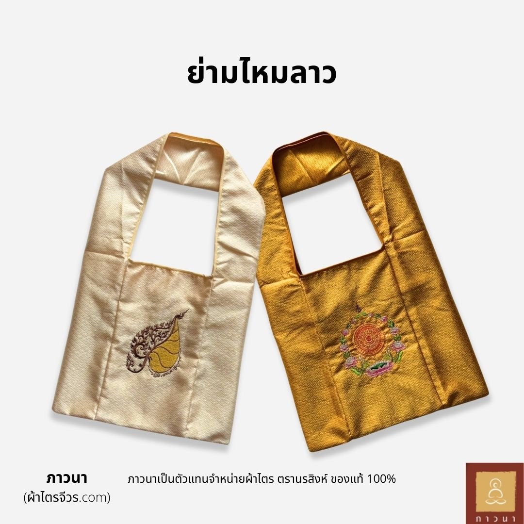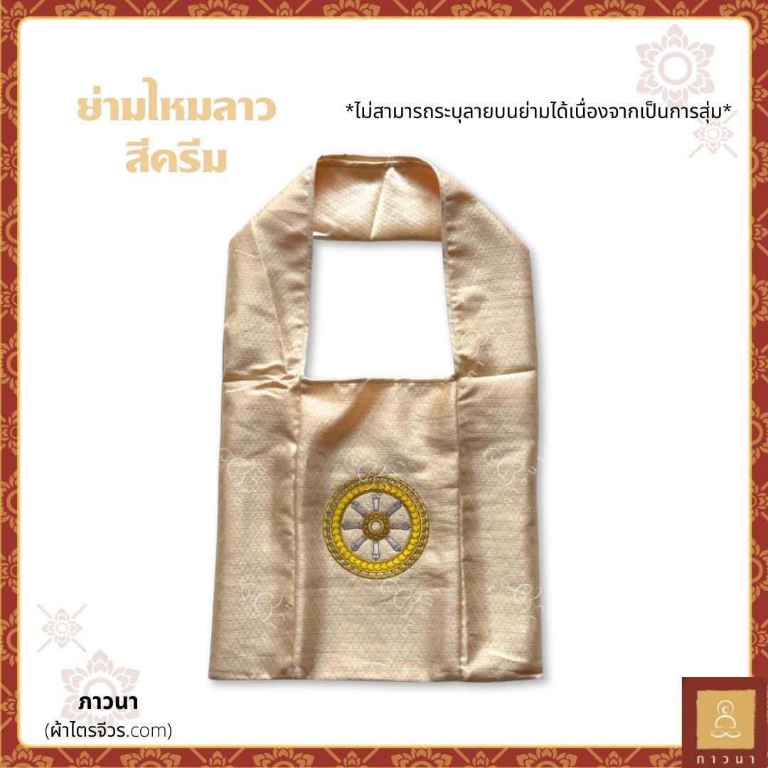 ย่ามพระไหมลาว สีครีมและสีพระราช ปักลายมงคล งานตัดเย็บประณีต เรียบร้อย เหมาะสำหรับใช้งานเองหรือถวายในงานบุญ มีกระเป๋าซิปด้านใน บรรจุของได้สะดวก