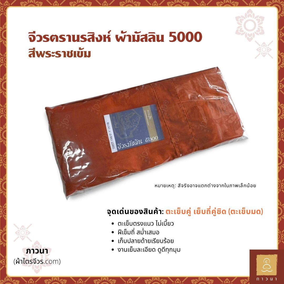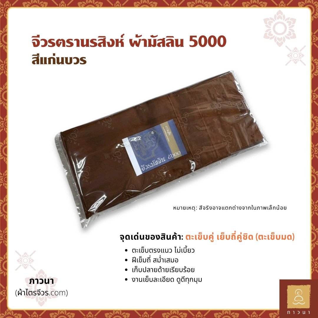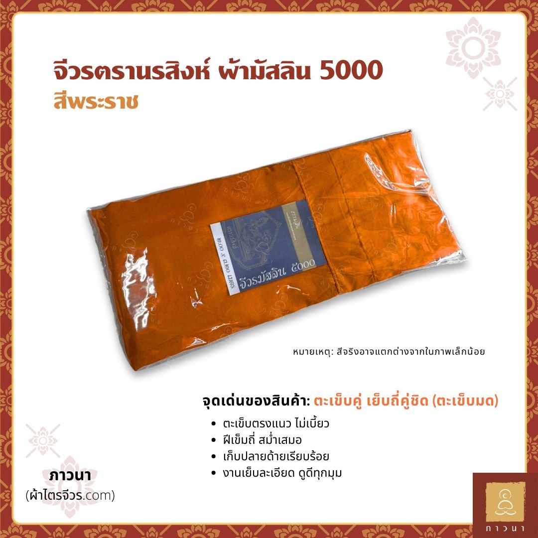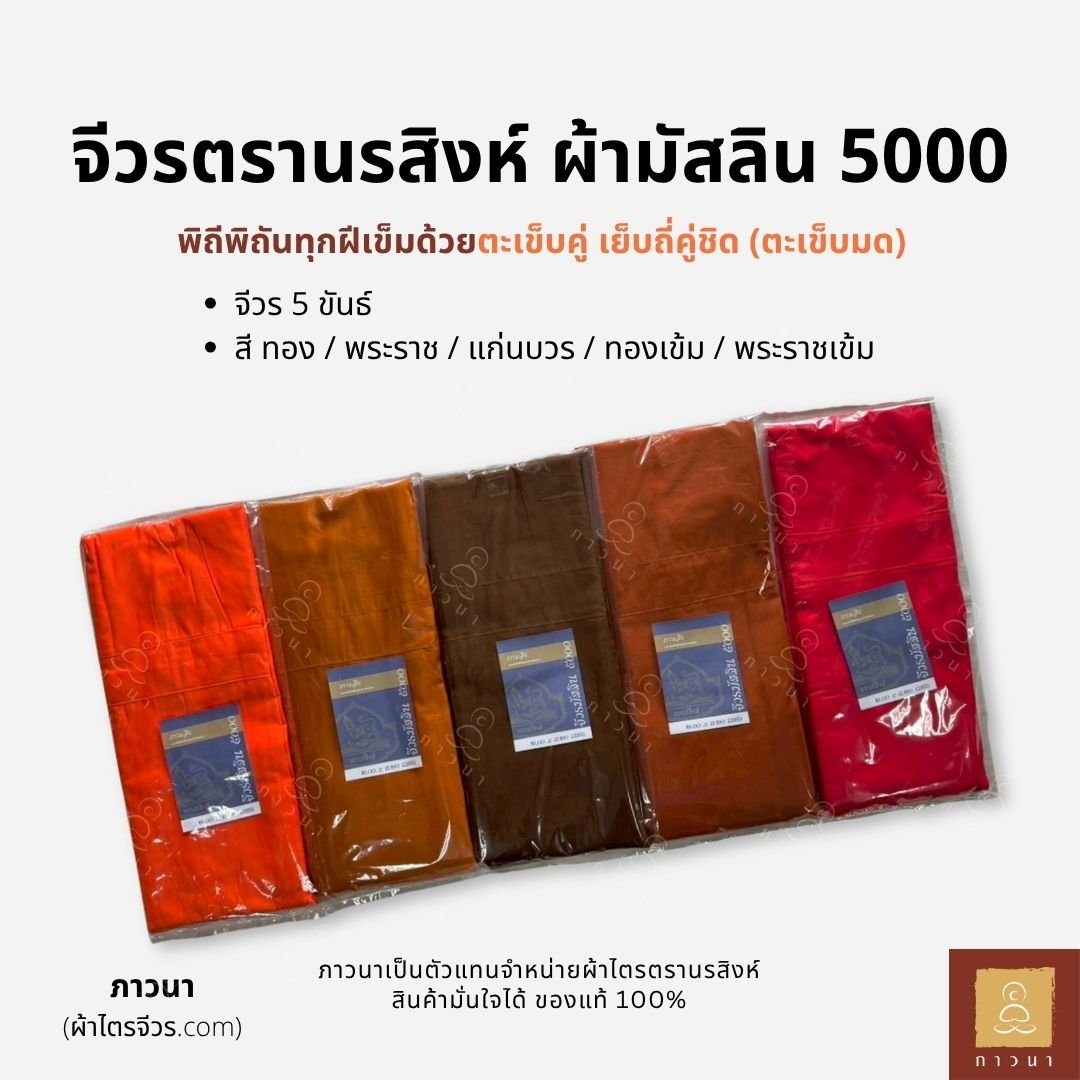 จีวร มัสลิน 5 ขันธ์ ตรานรสิงห์ รุ่นมัสลิน 5000 ผลิตจากผ้ามัสลินคุณภาพสูง ทอจากเส้นใยฝ้ายธรรมชาติ (Cotton) เนื้อผ้าละเอียด สัมผัสนุ่ม ระบายอากาศได้ดี เหมาะสำหรับพระภิกษุในทุกโอกาส